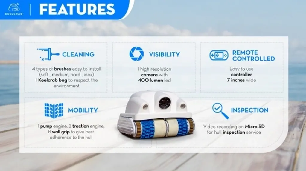 Alge i ostala vegetacija koja se prilijepi za dno broda, utječu na njegove performanse, potrošnju goriva i trajnost. Nije potrebno vaditi plovilo jer KeelCrab će efektivno očistiti trup dok je plovilo u vodi. Težak samo 9,5 kg, dugačak i širok 43 cm, te visok 38 cm, KeelCrab će za jednu minutu očistiti 2 kvadratna metra dna (prevedeno, to znači da bi dno 12-metarskog broda očistio za manje od jednog sata).
